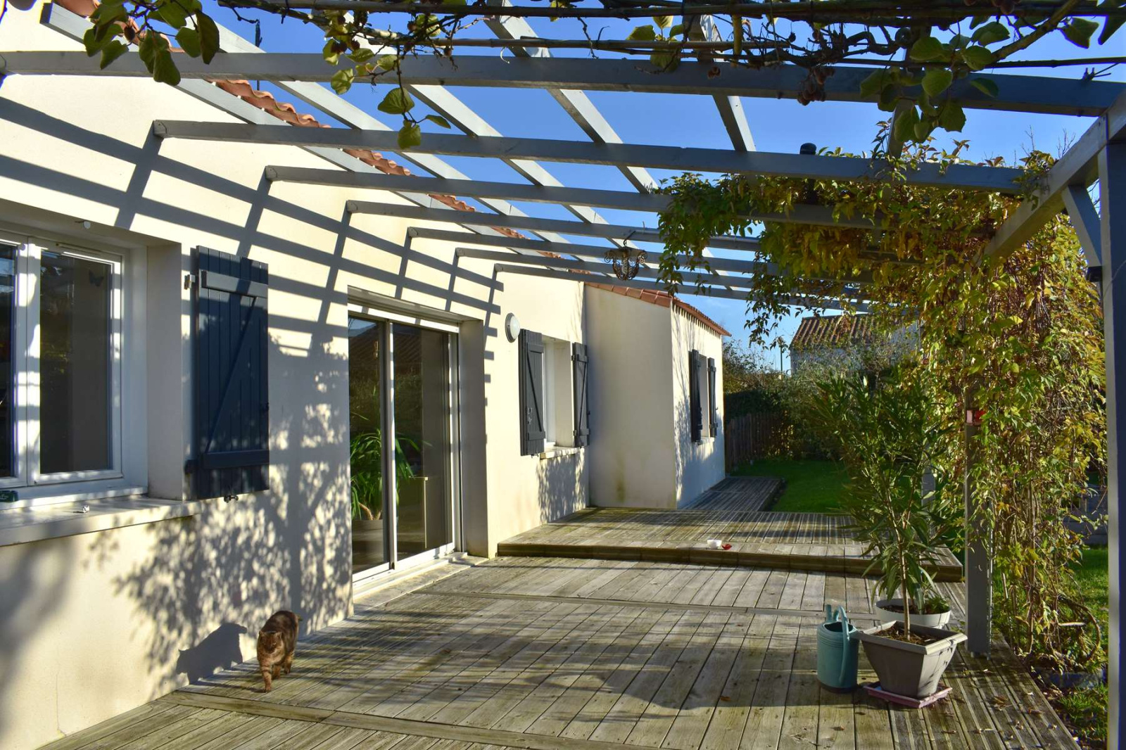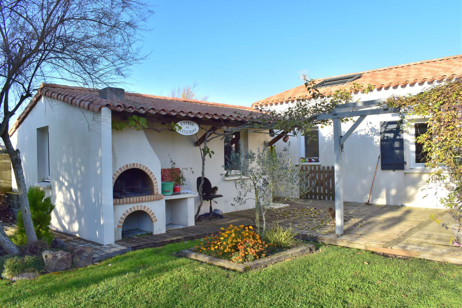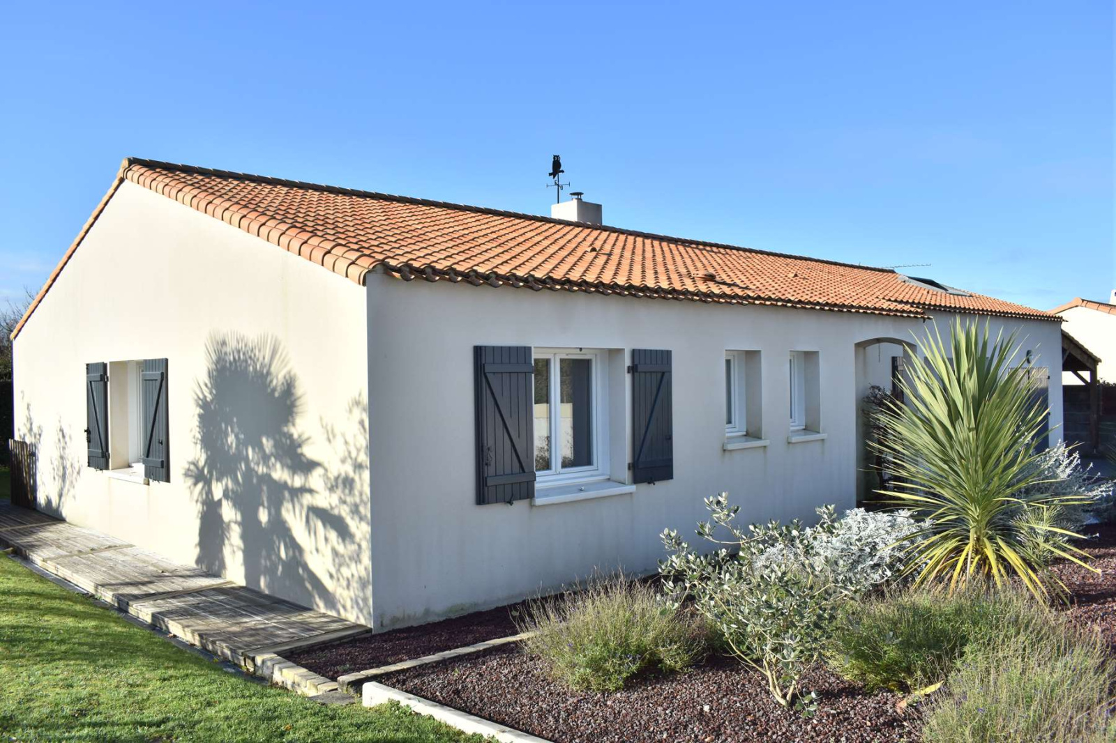 VENDU PAR ANP IMMOBILIER EN EXCLUSIVITE Au calme d'une impasse et à proximité immédiate de toutes commodités (écoles, commerces, infrastructures sportives...), venez découvrir cette maison de plain-pied lumineuse, idéale pour une famille. Elle est composée d'un bel espace de vie de 70 m² avec salon séjour agrémenté d'un poêle à bois et une grande cuisine dînatoire, un espace nuit disposant de 4 chambres avec placards, salle de bains avec douche italienne, baignoire et 2 vasques. Mezzanine pour espace bureau ou salon TV, arrière-cuisine, chaufferie, grand carport de 30 m² et un atelier de 25 m². Grande terrasse en bois d'environ 80 m² avec pergola exposée sud ouest, le tout sur un jardin clos et arboré de plus de 880m² - Classe énergie C - Prix de vente 263 500 € dont 5.40% TTC d'honoraire charge acquéreur (Prix 250 000 € hors honoraires).